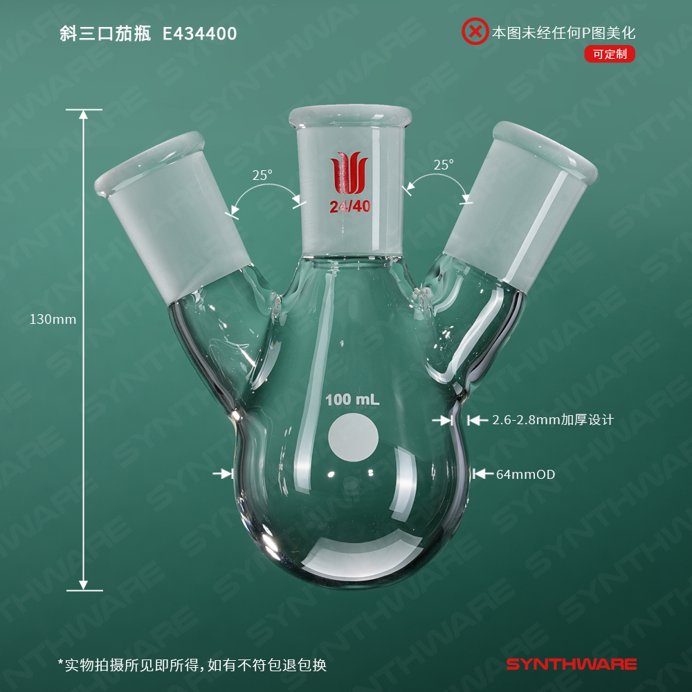 斜三口茄瓶,厚壁高强度,中间磨口:24/40,侧磨口:14/20,100ml E434100