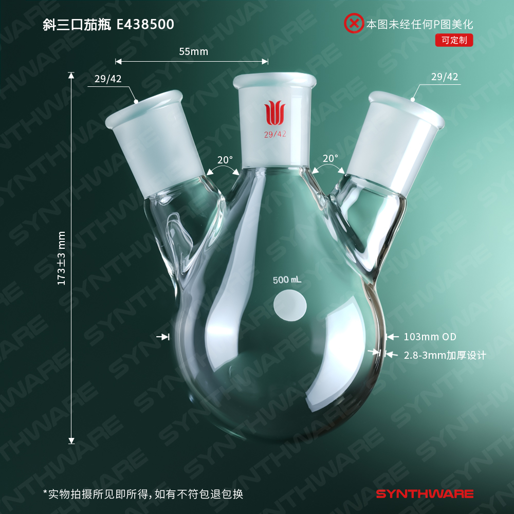 斜三口茄瓶,厚壁高强度,中间磨口:29/42,侧磨口:24/40,500ml E436500