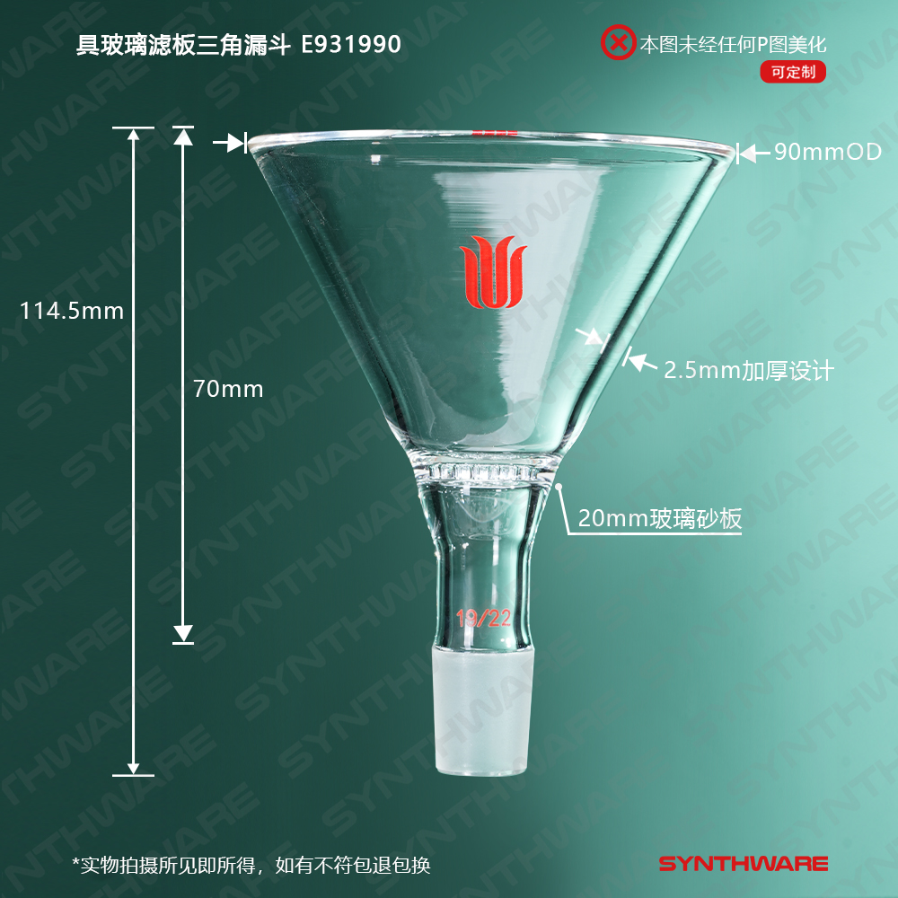 具玻璃滤板三角漏斗,磨口:19/22,砂板直径20mm漏斗上口外径90mm E931990