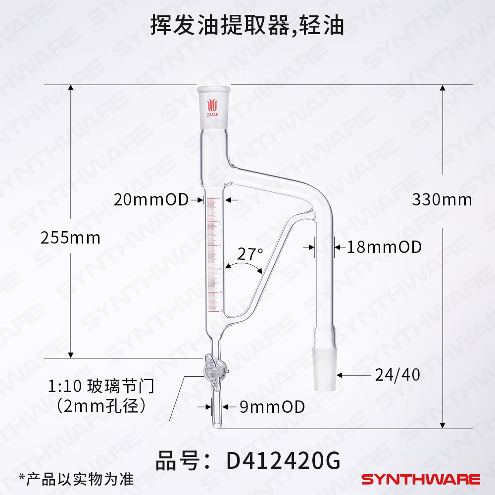 挥发油提取器,轻油,带刻度,磨口24/40,容量:20ml,玻璃节门 D412420G