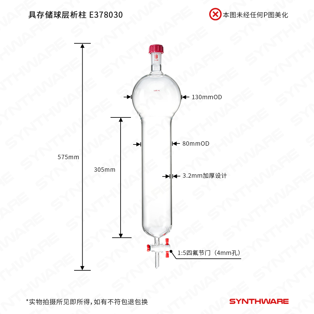 层析类 > 具存储球层析柱 > 外螺纹口 > SYNTHWARE > 具存储球层析柱,外螺纹口24/40,φ80mm,有效长305mm,存储球:1000ml E378030
