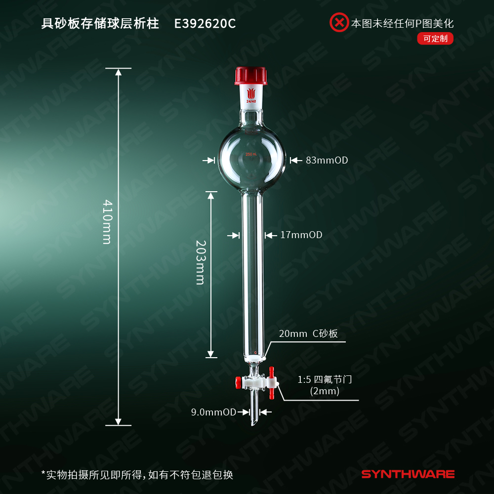 具砂板存储球层析柱,外螺纹口24/40,φ26mm,有效长203mm,存储球容量250ml E392620C
