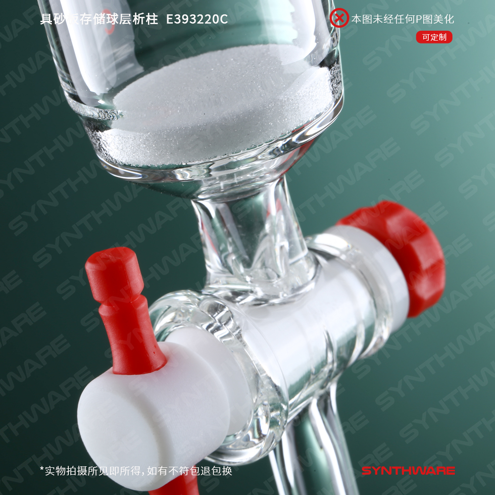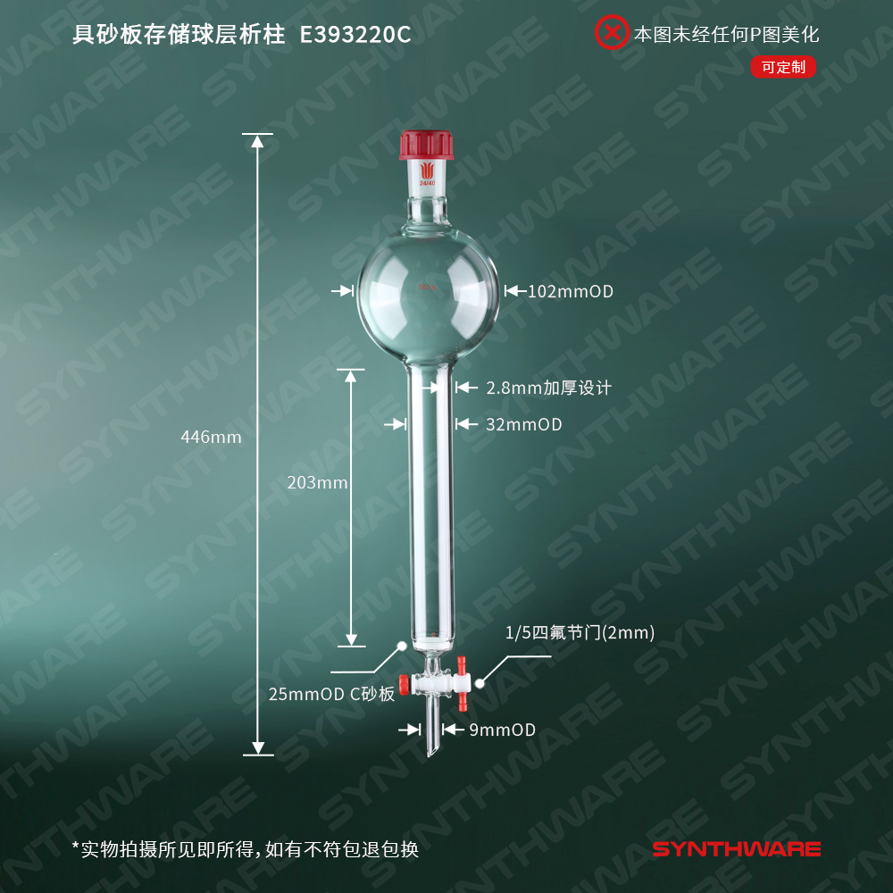 层析类 > 具存储球层析柱 > 外螺纹口 > SYNTHWARE > 具砂板存储球层析柱,外螺纹口24/40,φ32mm,有效长203mm,存储球容量500ml E393220C