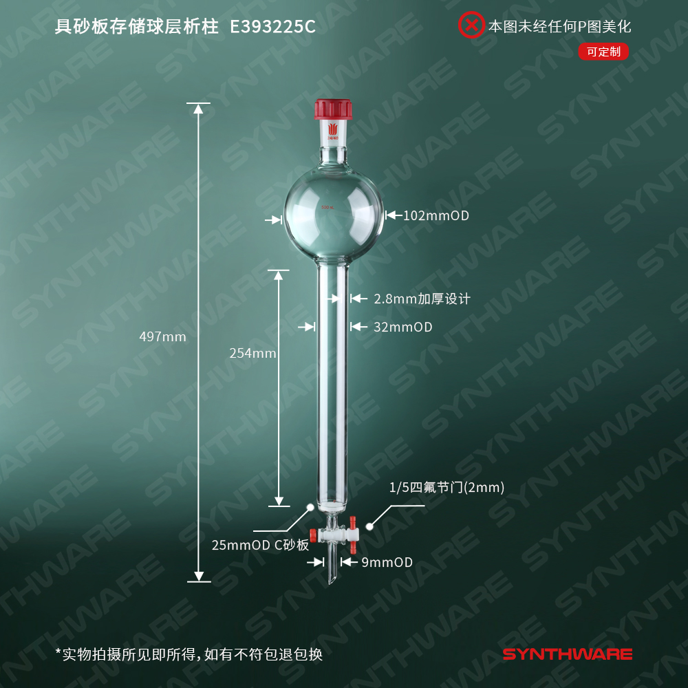 层析类 > 具存储球层析柱 > 外螺纹口 > SYNTHWARE > 具砂板存储球层析柱,外螺纹口24/40,φ32mm,有效长254mm,存储球容量500ml E393225C