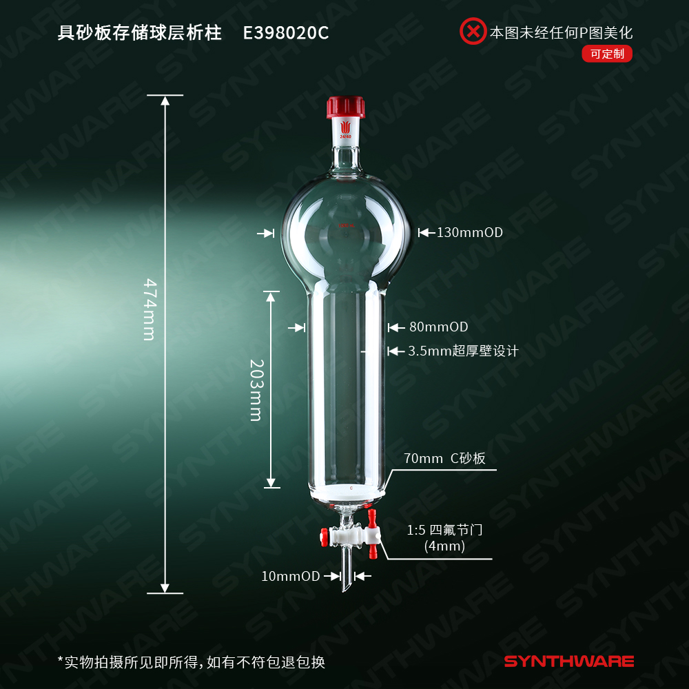 层析类 > 具存储球层析柱 > 外螺纹口 > SYNTHWARE > 具砂板存储球层析柱,外螺纹口24/40,φ80mm,有效长203mm,存储球容量1000ml E398020C