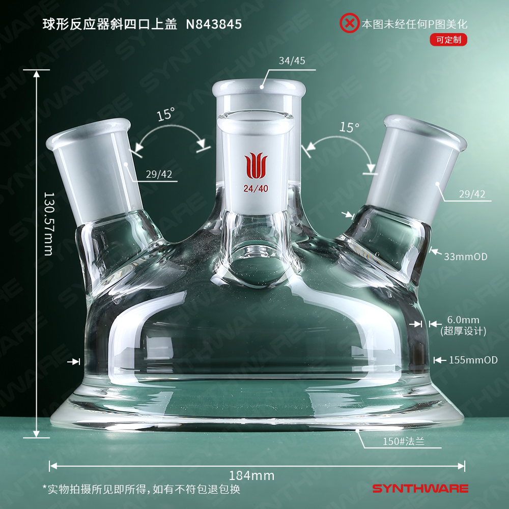 球形反应器斜四口上盖,主口34/45,侧口29/42,前口24/40,法兰150# N843845