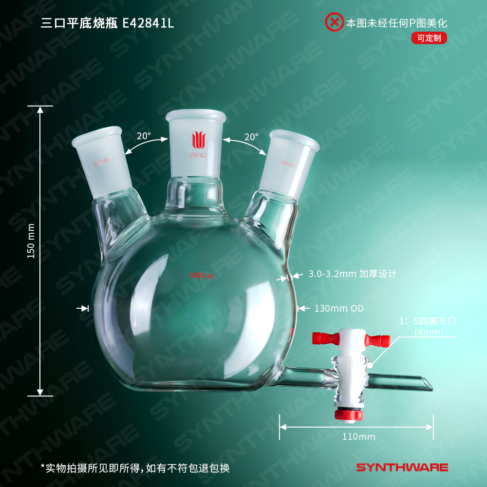 三口平底烧瓶,具横向四氟节门,中间磨口:29/42,侧磨口:24/40,1000ml E42841L