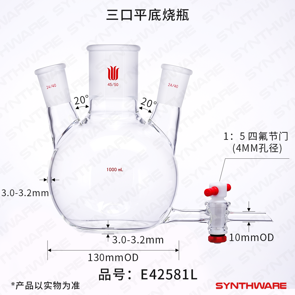 三口平底烧瓶,具横向四氟节门,中间磨口:45/50,侧磨口:24/40,1000ml E42581L