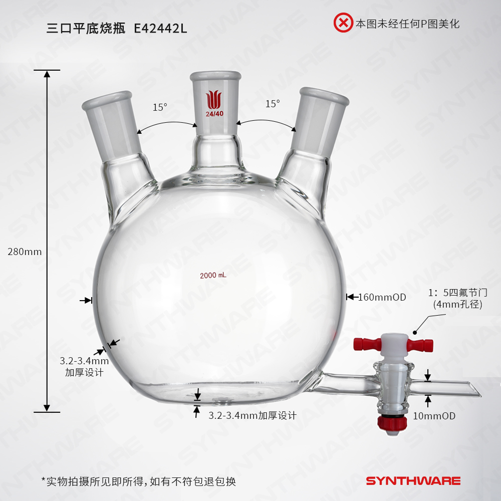 三口平底烧瓶,具横向四氟节门,中间磨口:24/40,侧磨口:24/40,2000ml E42442L