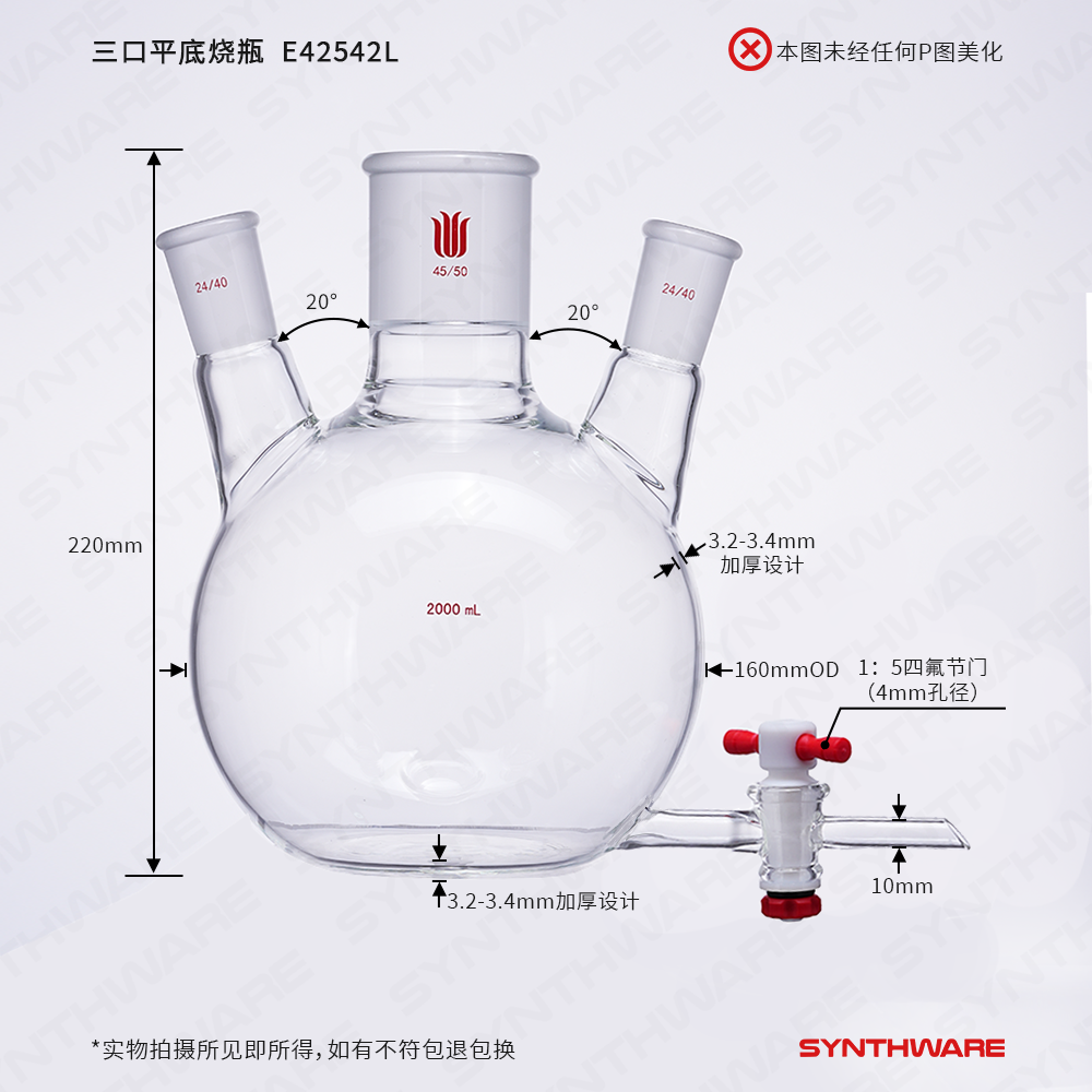 三口平底烧瓶,具横向四氟节门,中间磨口:45/50,侧磨口:24/40,2000ml E42542L