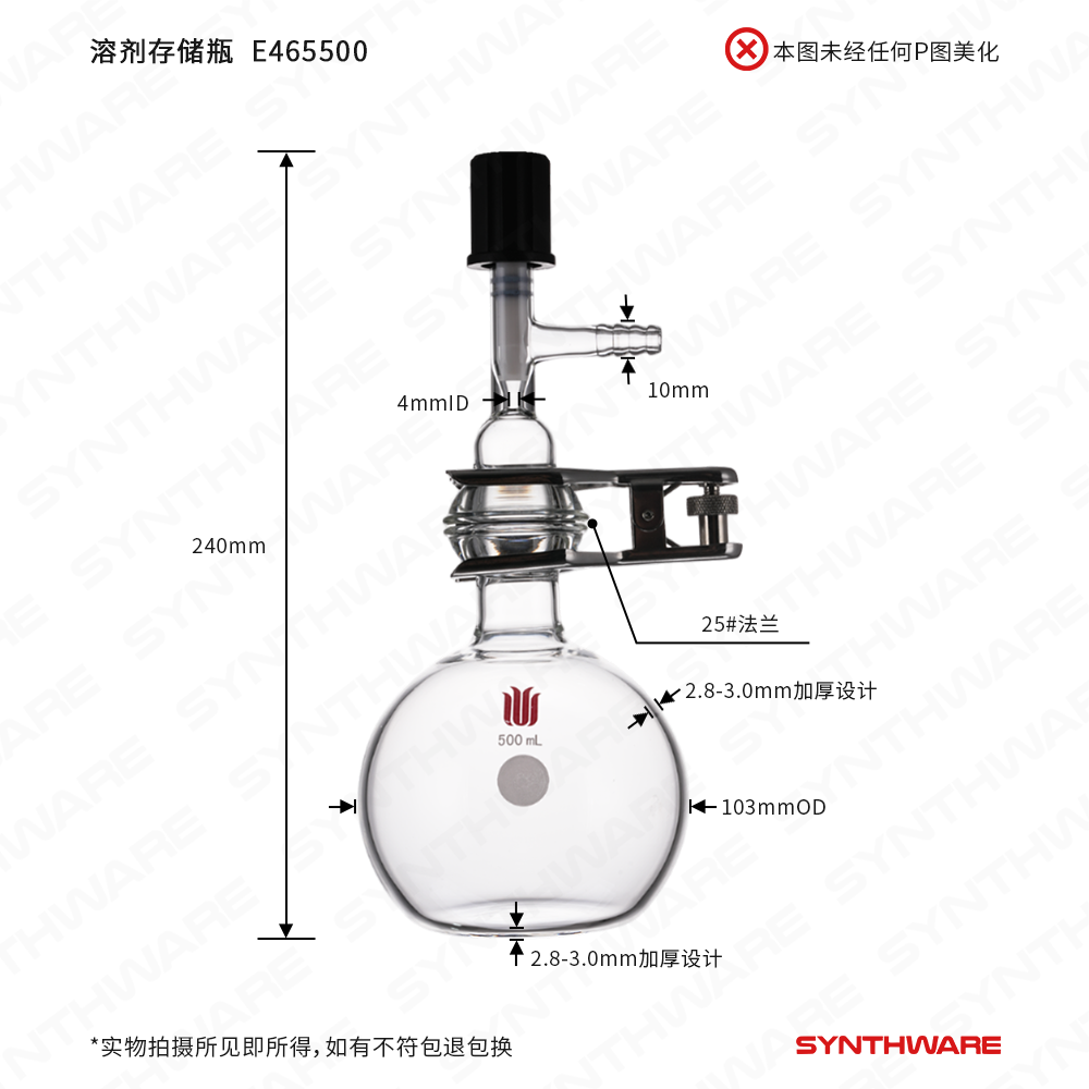 溶剂存储瓶,分体式,平底球,25#法兰连接头,8mm高真空阀,500ml E465508