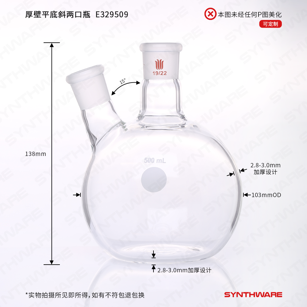 厚壁平底斜两口瓶,高强度,中间磨口:14/20,侧磨口:14/20,500ml E321500