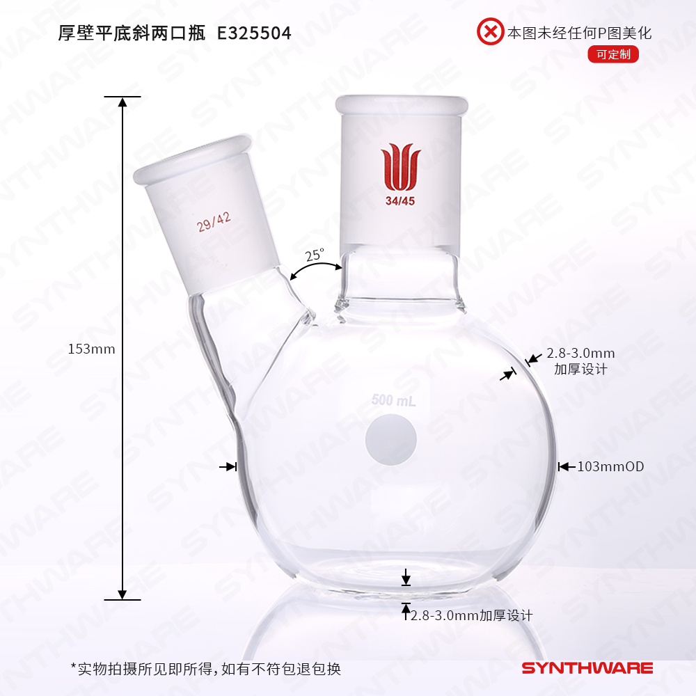 厚壁平底斜两口瓶,高强度,中间磨口:14/20,侧磨口:14/20,500ml E321500