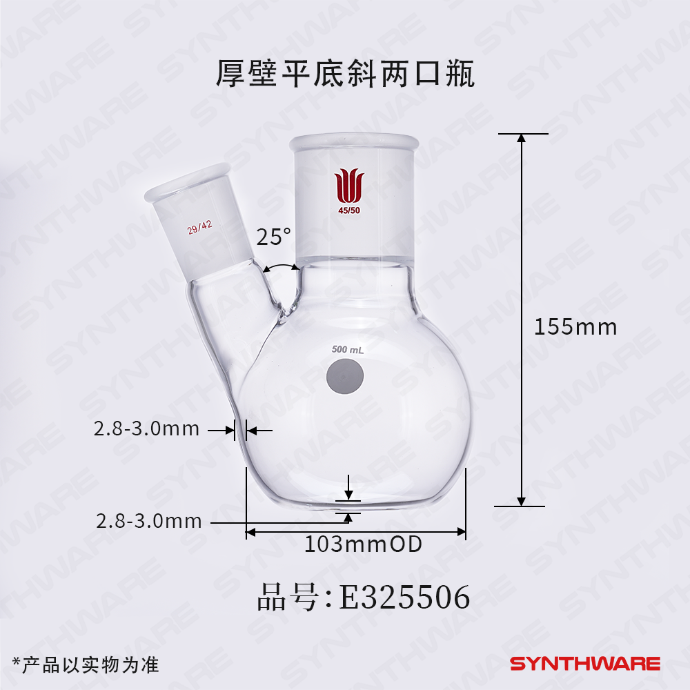 厚壁平底斜两口瓶,高强度,中间磨口:29/42,侧磨口:24/40,500ml E325501