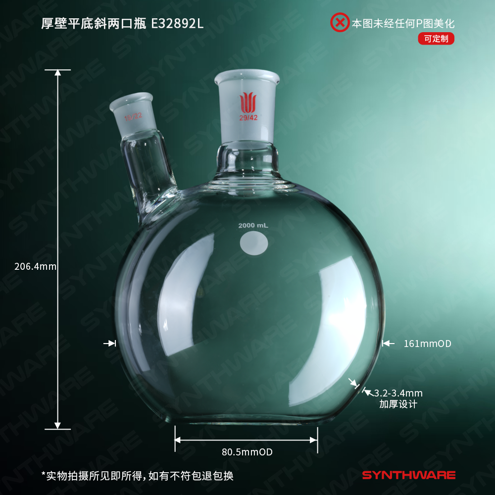 厚壁平底斜两口瓶,高强度,中间磨口:24/40,侧磨口:24/40,2000ml E32242L