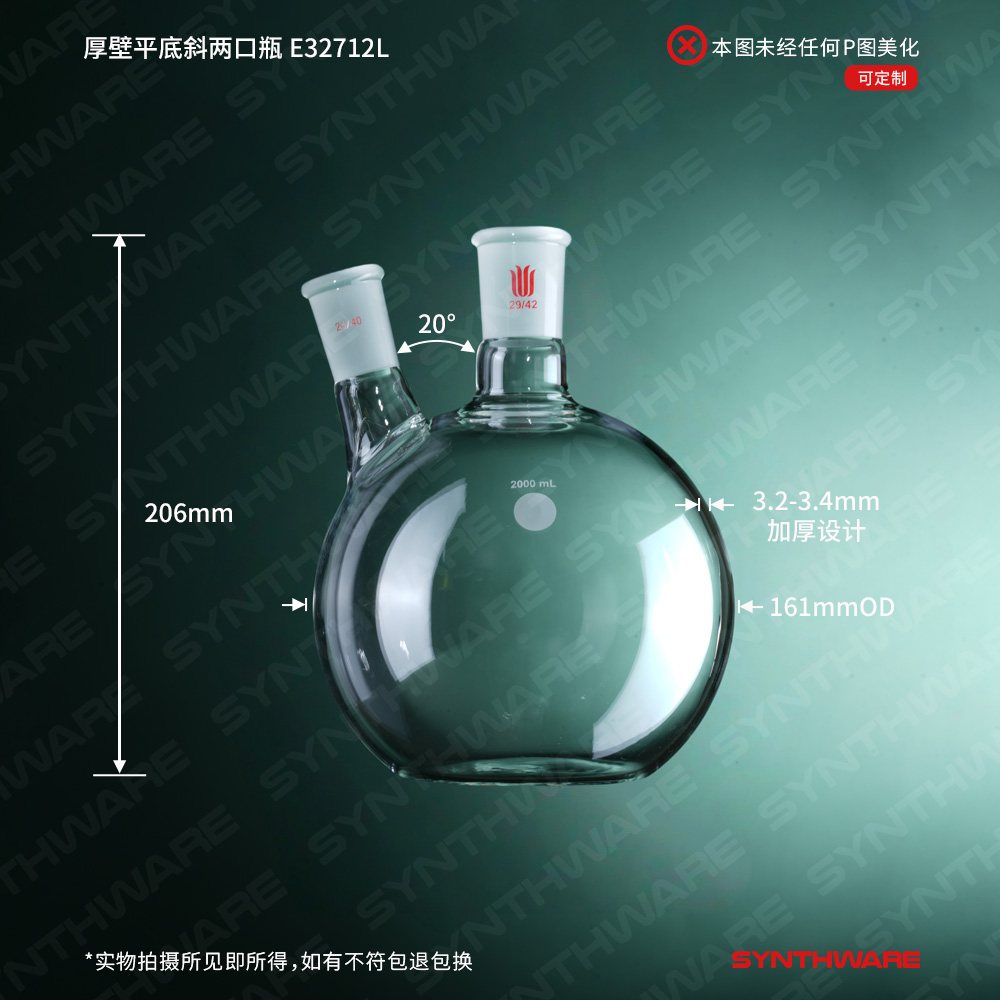 厚壁平底斜两口瓶,高强度,中间磨口:24/40,侧磨口:24/40,2000ml E32242L