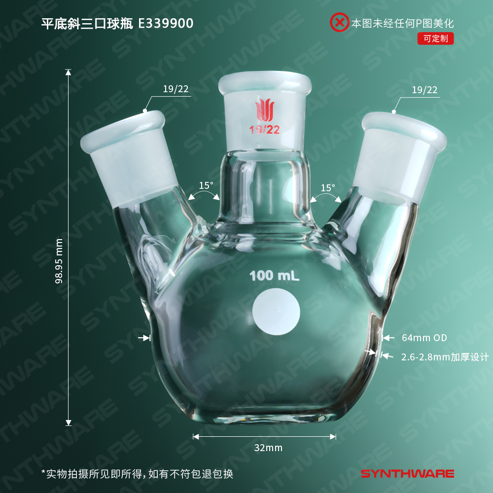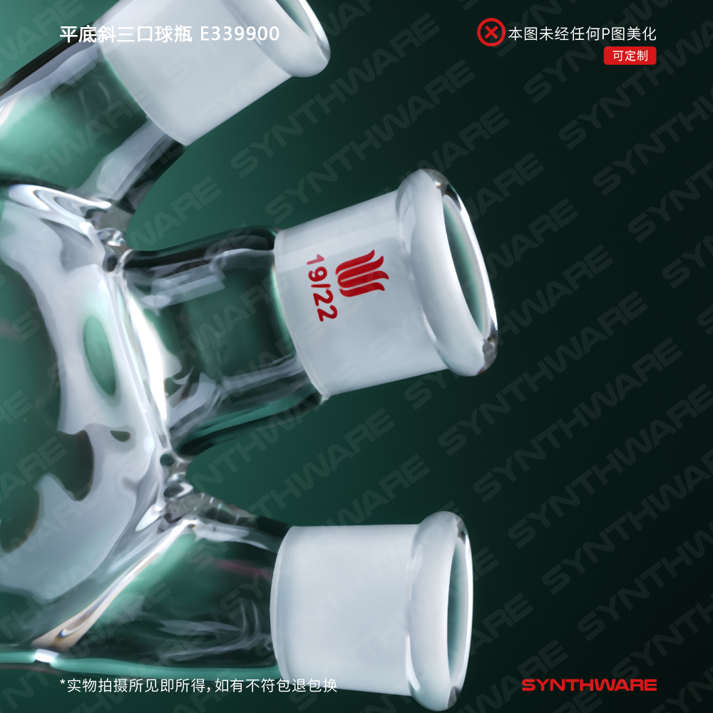 平底斜三口球瓶,厚壁高强度,中间磨口:19/22,侧磨口:14/20,100ml E339100