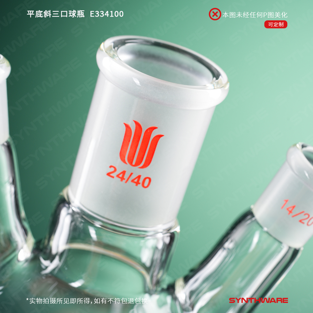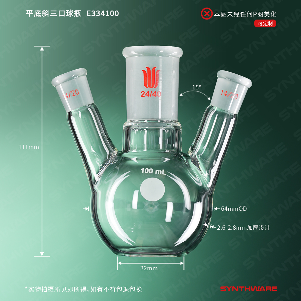 平底斜三口球瓶,厚壁高强度,中间磨口:24/40,侧磨口:24/40,100ml E334400