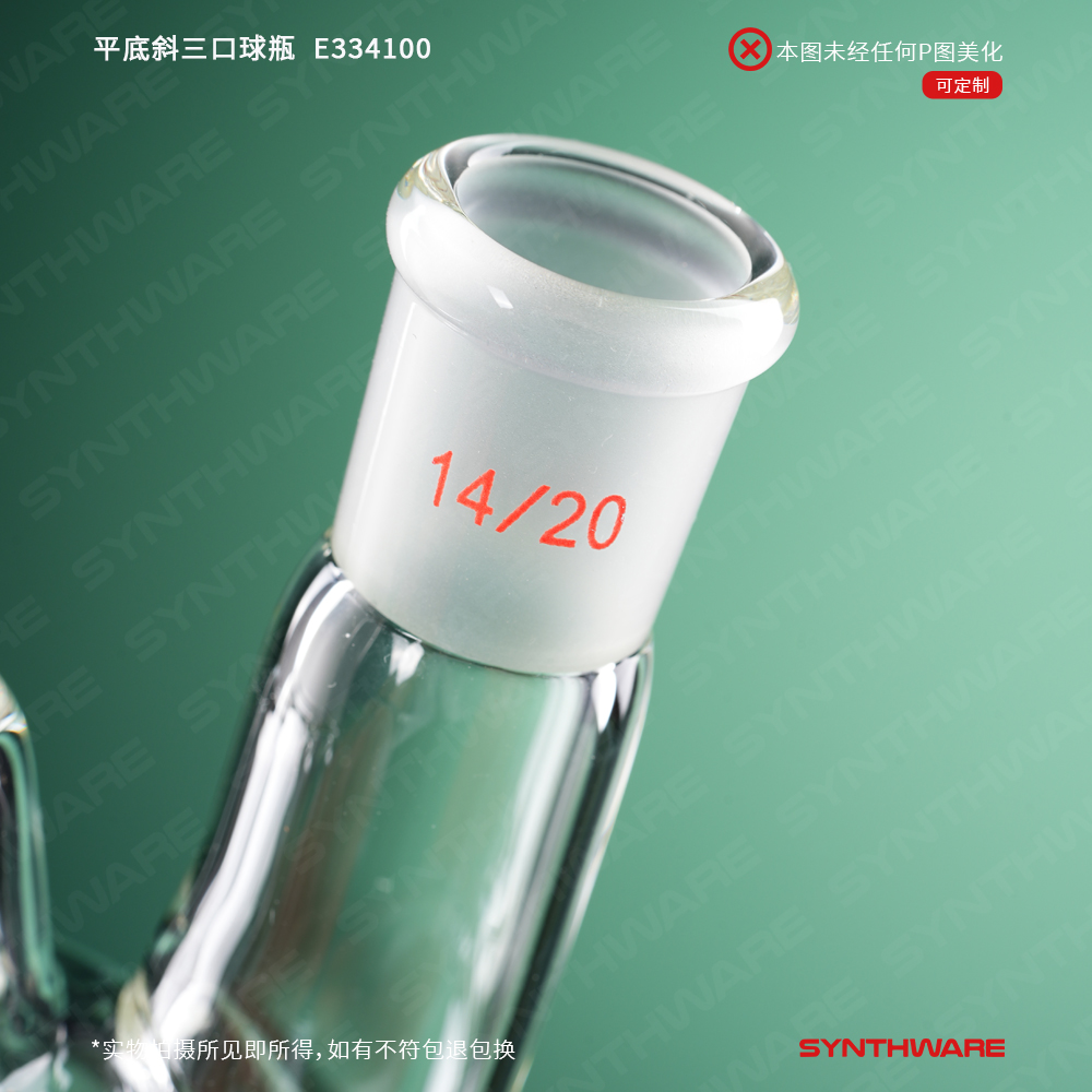 平底斜三口球瓶,厚壁高强度,中间磨口:19/22,侧磨口:14/20,100ml E339100
