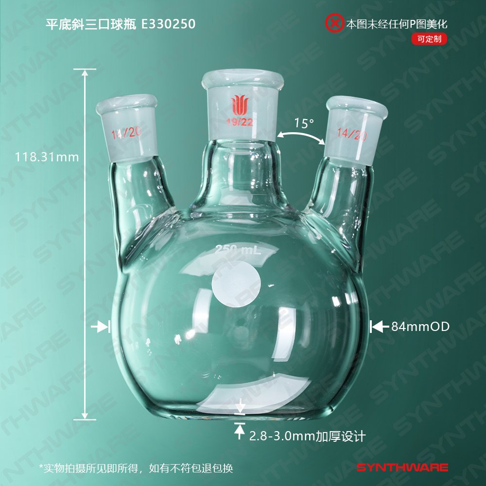 平底斜三口球瓶,厚壁高强度,中间磨口:24/40,侧磨口:24/40,250ml E334250