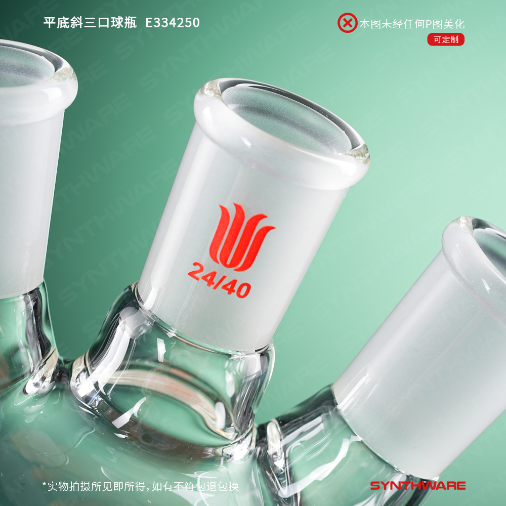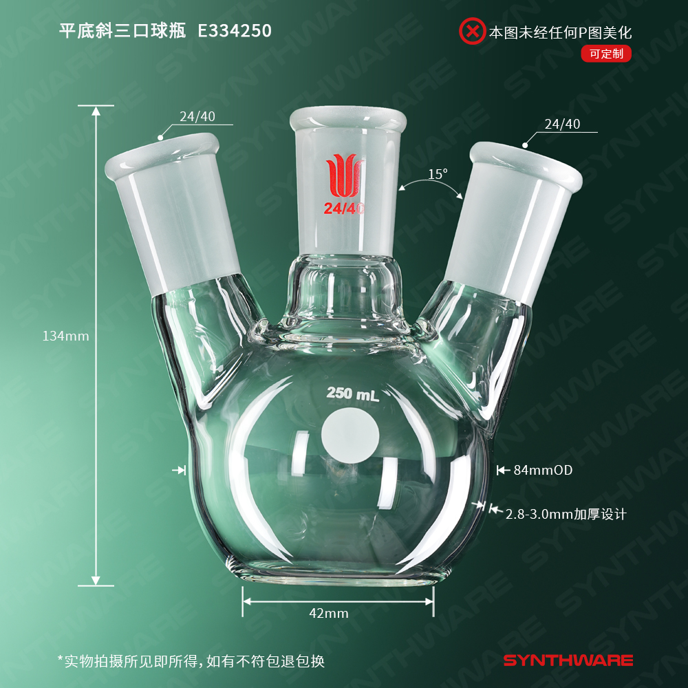 平底斜三口球瓶,厚壁高强度,中间磨口:24/40,侧磨口:14/20,100ml E334100