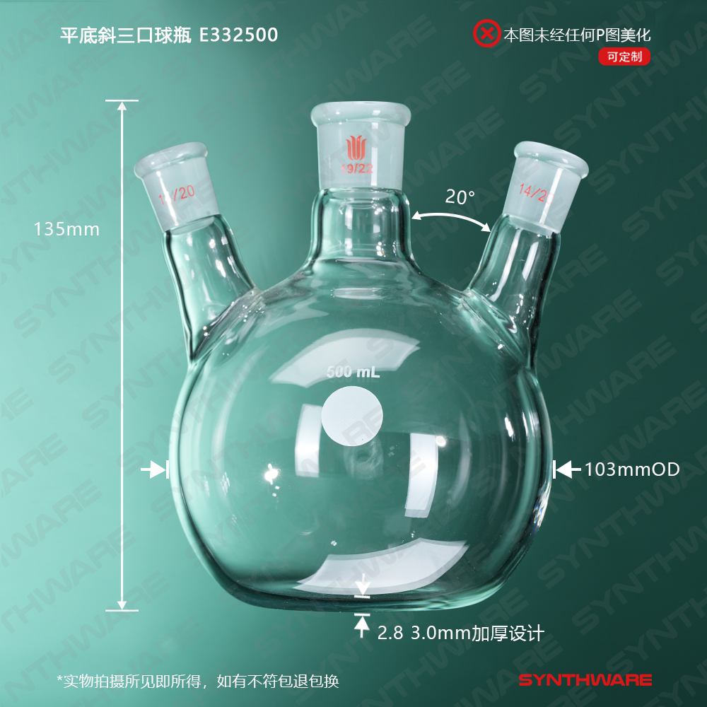 平底斜三口球瓶,厚壁高强度,中间磨口:14/20,侧磨口:14/20,500ml E331500