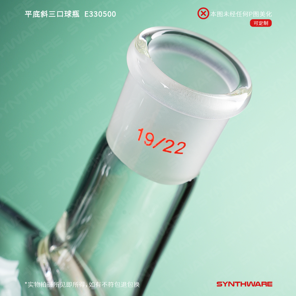平底斜三口球瓶,厚壁高强度,中间磨口:19/22,侧磨口:19/22,100ml E339900