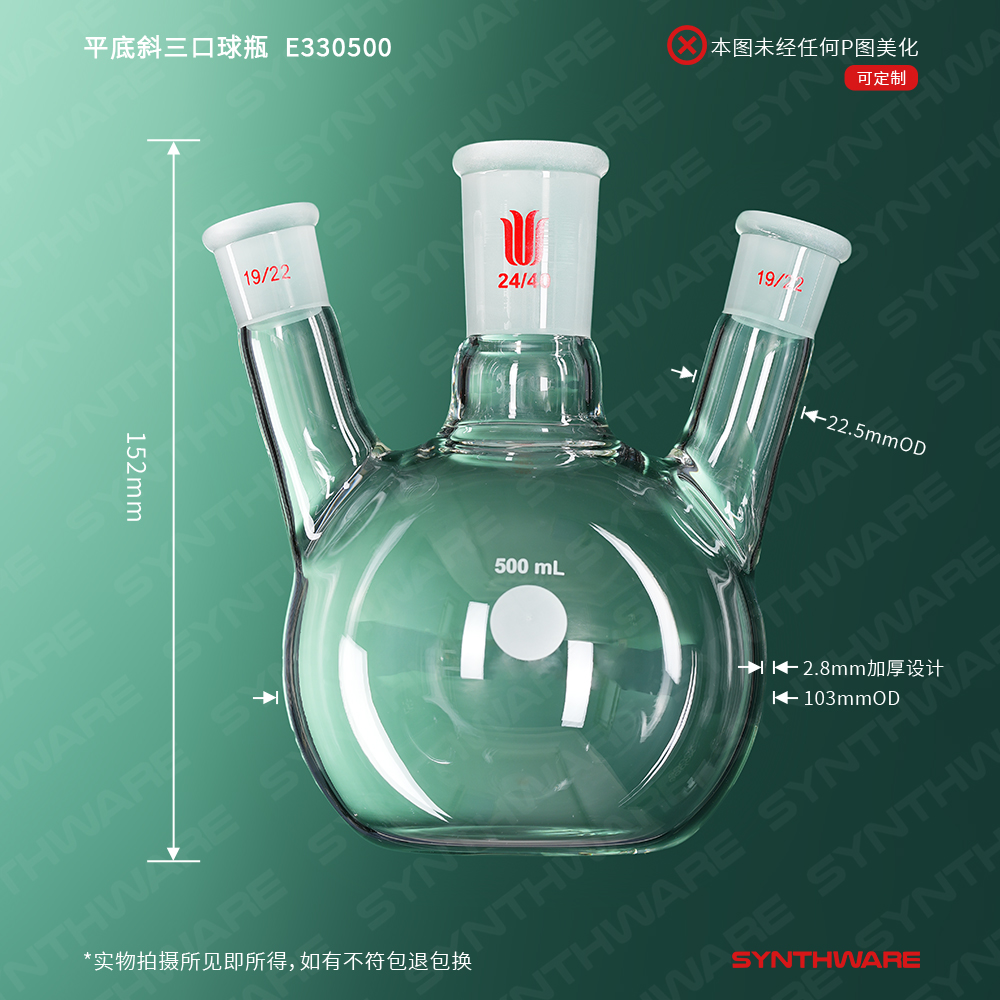 平底斜三口球瓶,厚壁高强度,中间磨口:24/40,侧磨口:24/40,500ml E334500