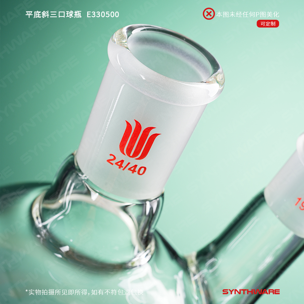 平底斜三口球瓶,厚壁高强度,中间磨口:24/40,侧磨口:24/40,100ml E334400