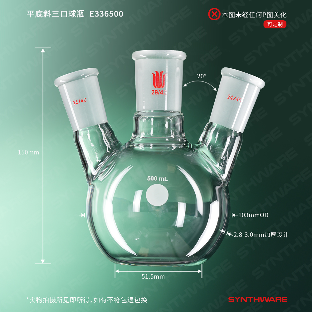 平底斜三口球瓶,厚壁高强度,中间磨口:34/45,侧磨口:24/40,500ml E333424