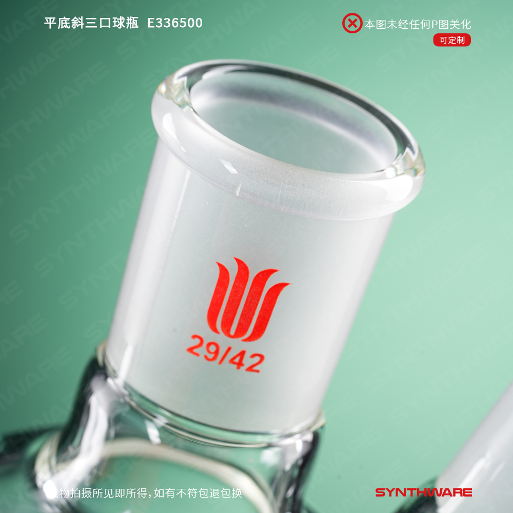 平底斜三口球瓶,厚壁高强度,中间磨口:29/42,侧磨口:29/42,500ml E338500
