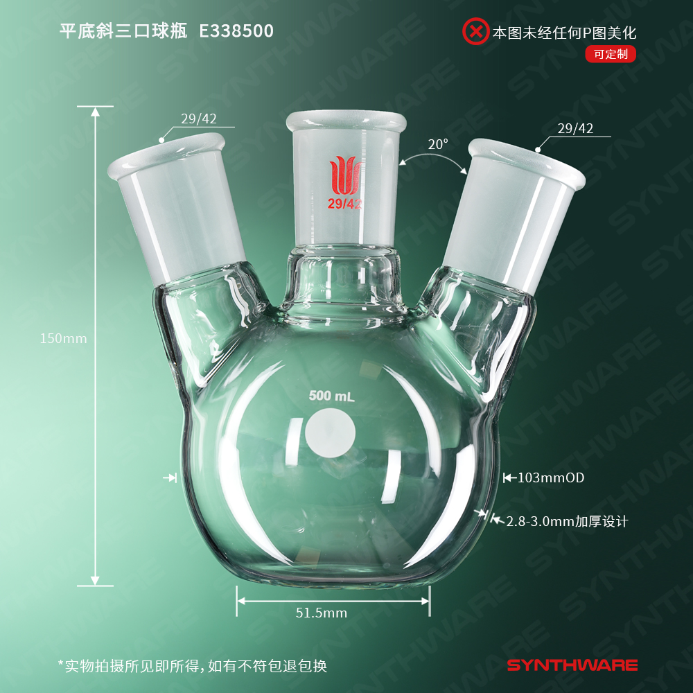 平底斜三口球瓶,厚壁高强度,中间磨口:29/42,侧磨口:24/40,500ml E336500