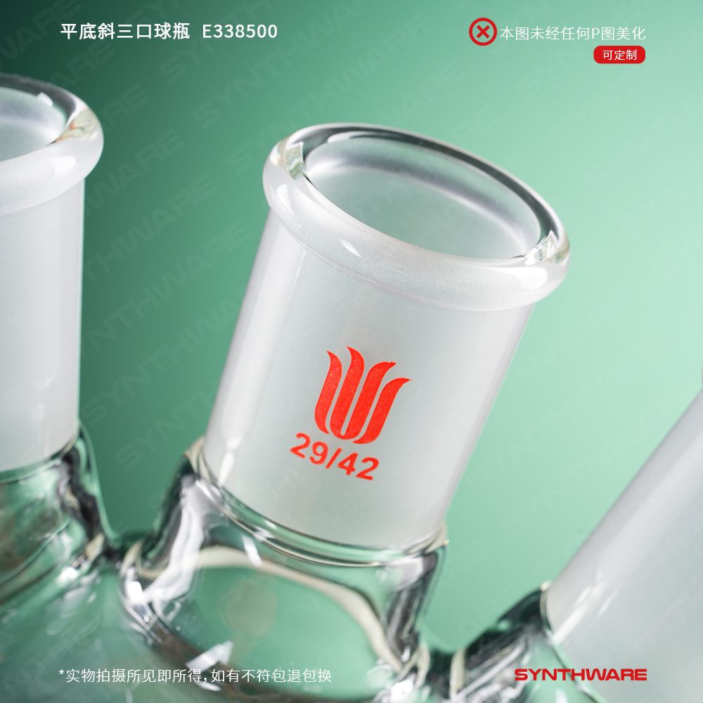 平底斜三口球瓶,厚壁高强度,中间磨口:34/45,侧磨口:29/42,500ml E333429