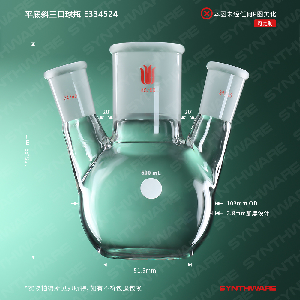 平底斜三口球瓶,厚壁高强度,中间磨口:24/40,侧磨口:24/40,500ml E334500