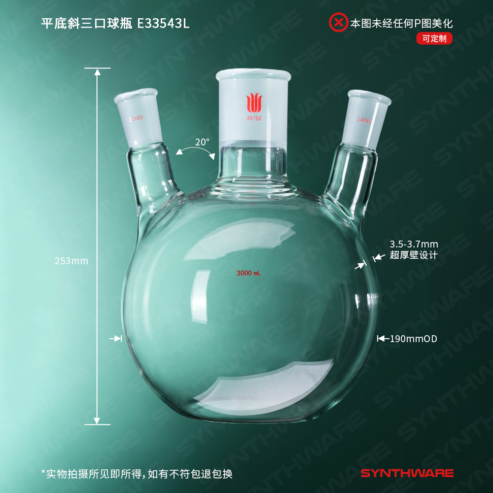 平底斜三口球瓶,厚壁高强度,中间磨口:34/45,侧磨口:29/42,3000ml E33383L