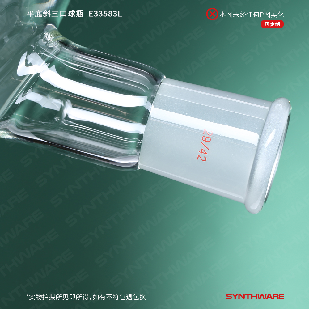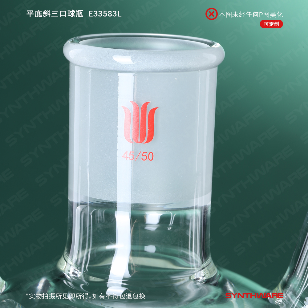 平底斜三口球瓶,厚壁高强度,中间磨口:34/45,侧磨口:29/42,1000ml E33381L