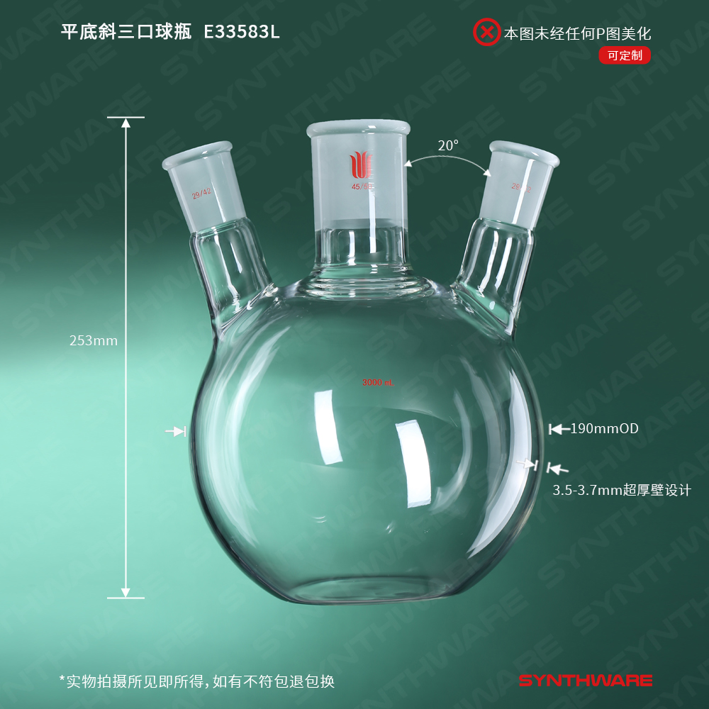 平底斜三口球瓶,厚壁高强度,中间磨口:34/45,侧磨口:29/42,3000ml E33383L