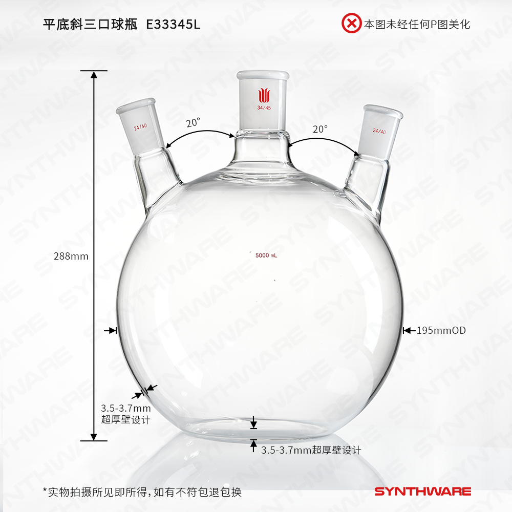 平底斜三口球瓶,厚壁高强度,中间磨口:34/45,侧磨口:29/42,3000ml E33383L