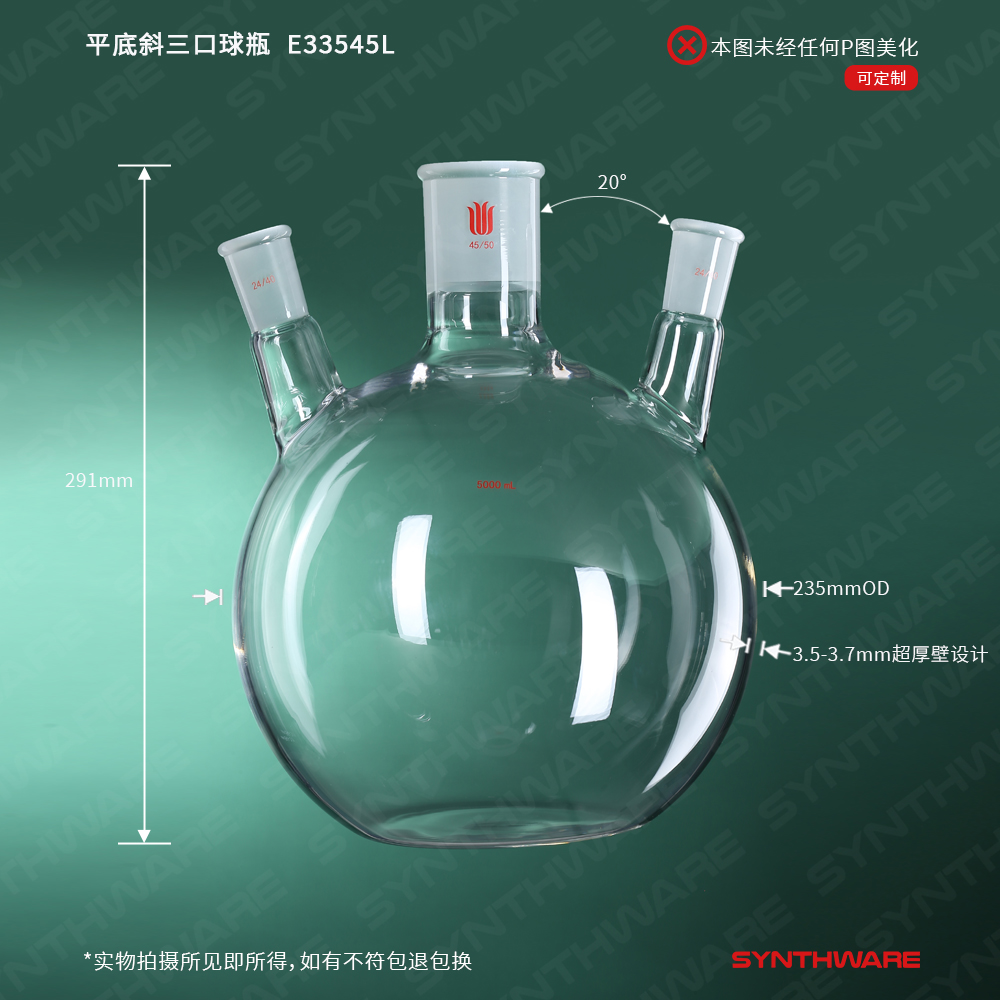 平底斜三口球瓶,厚壁高强度,中间磨口:34/45,侧磨口:29/42,2000ml E33382L