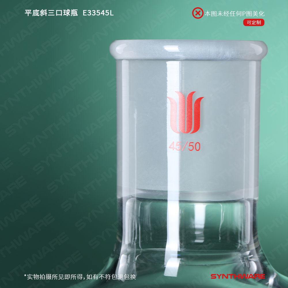 平底斜三口球瓶,厚壁高强度,中间磨口:34/45,侧磨口:29/42,1000ml E33381L