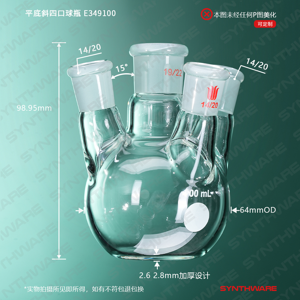 平底斜四口球瓶,中间口:24/40,侧磨口:14/20,前口:14/20,100ml E344100