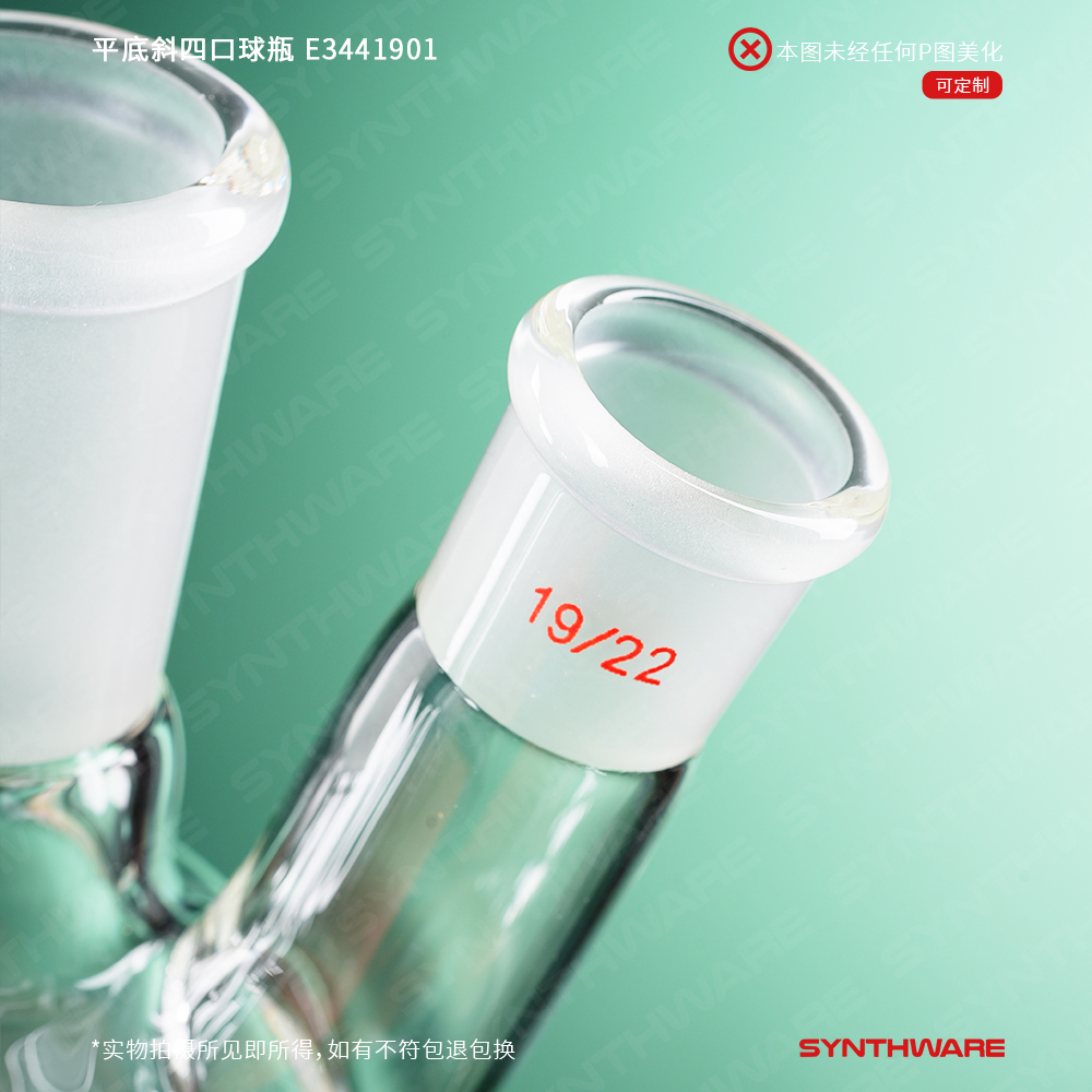 平底斜四口球瓶,中间口:19/22,侧磨口:14/20,前口:14/20,100ml E349100