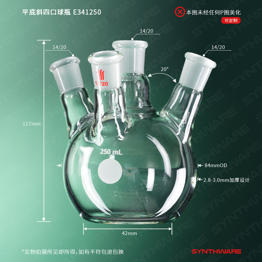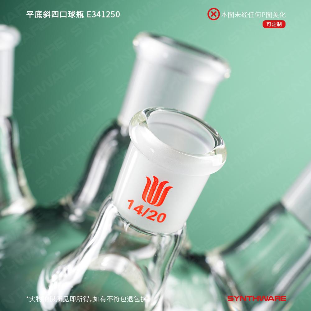 平底斜四口球瓶,中间口:24/40,侧磨口:14/20,前口:14/20,100ml E344100