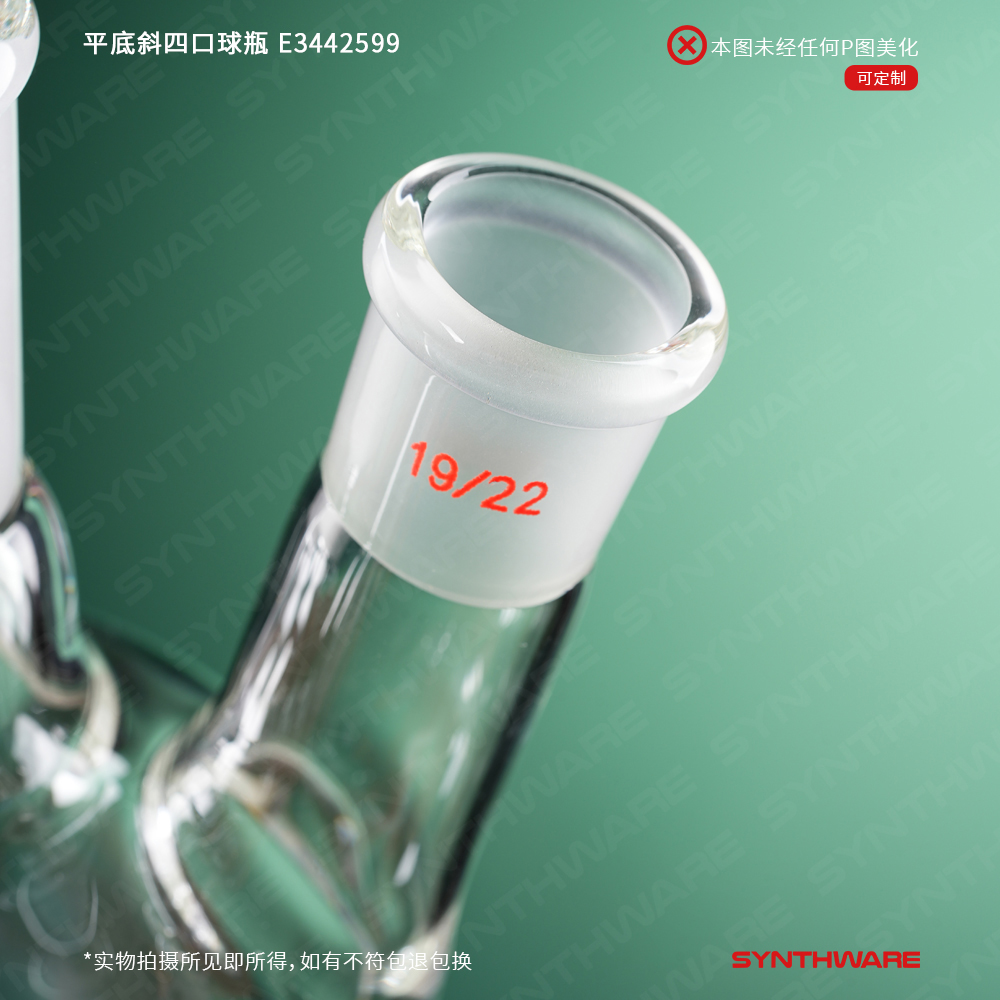 平底斜四口球瓶,中间口:19/22,侧磨口:14/20,前口:14/20,100ml E349100