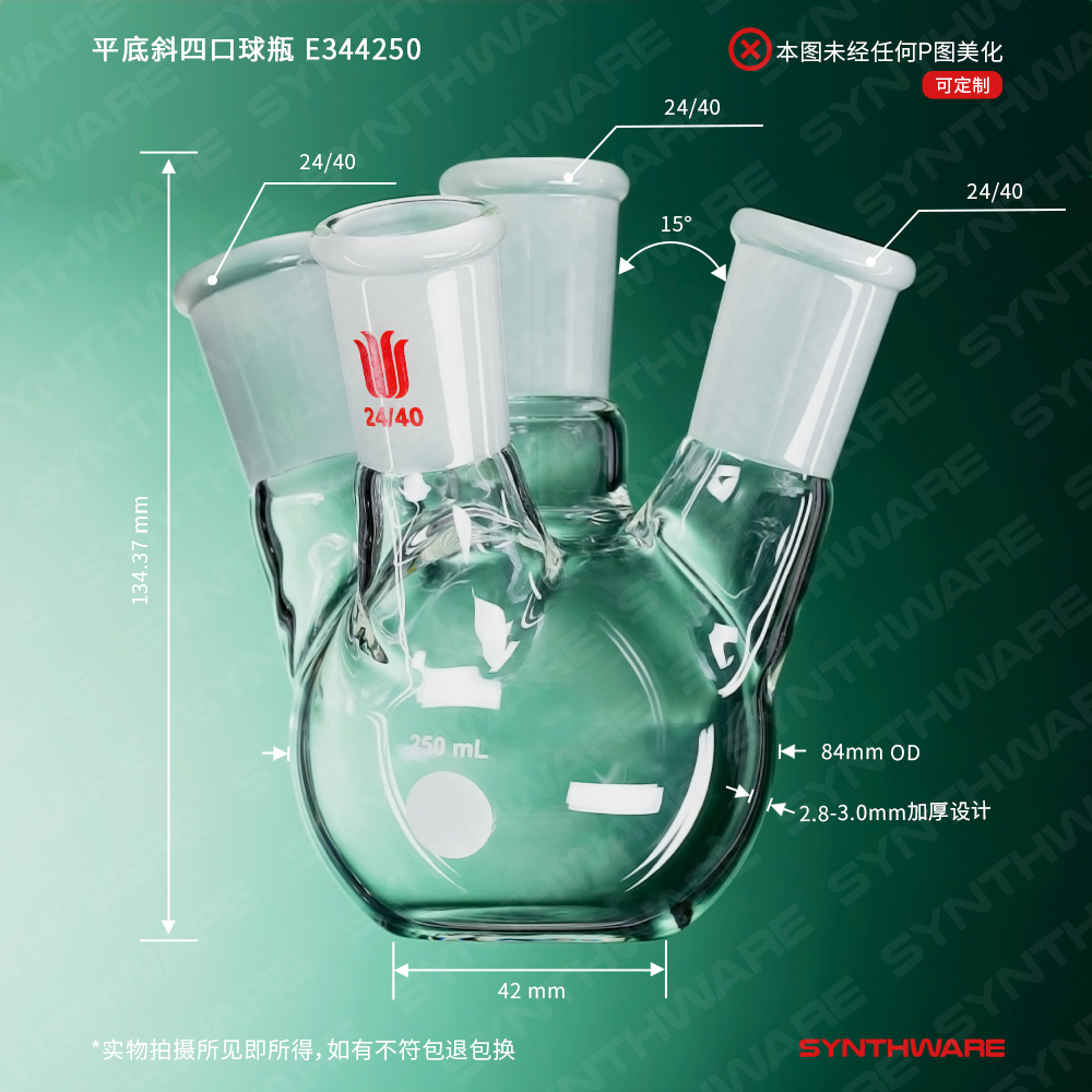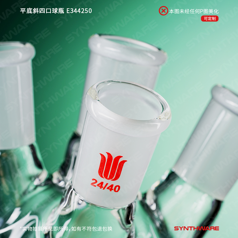 平底斜四口球瓶,中间口:24/40,侧磨口:14/20,前口:14/20,100ml E344100