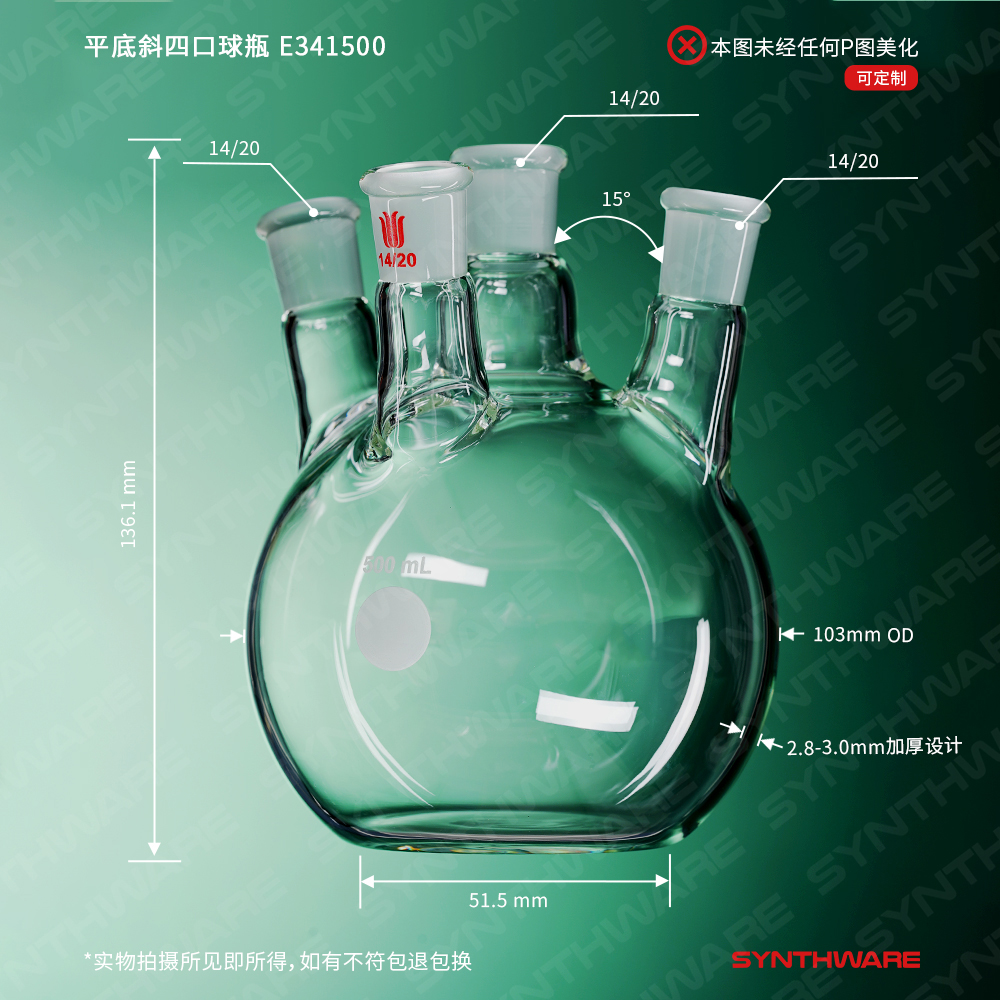 平底斜四口球瓶,中间口:29/42,侧磨口:24/40,前口:24/40,500ml E342500