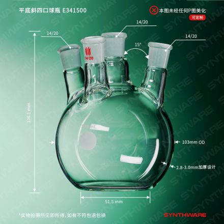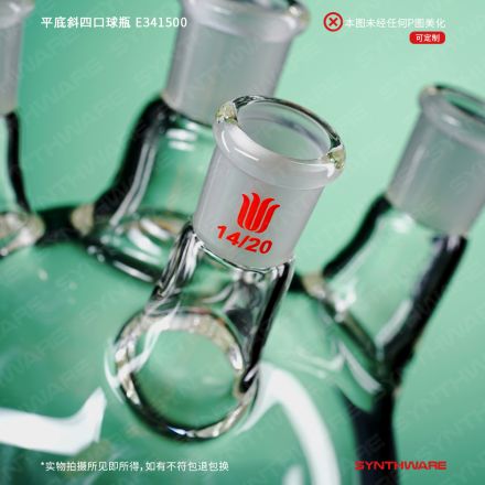平底斜四口球瓶,中间口:14/20,侧磨口:14/20,前口:14/20,100ml E341100