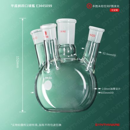 平底斜四口球瓶,中间口:34/45,侧磨口:24/40,前口:24/40,500ml E343500