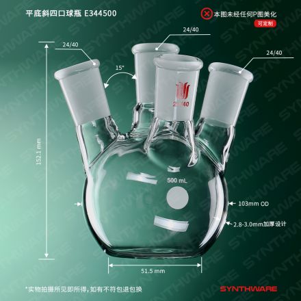 平底斜四口球瓶,中间口:34/45,侧磨口:24/40,前口:24/40,500ml E343500