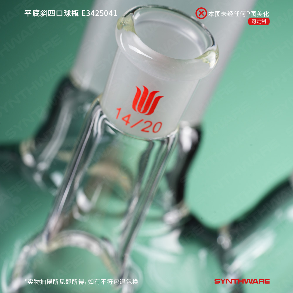 平底斜四口球瓶,中间口:14/20,侧磨口:14/20,前口:14/20,100ml E341100